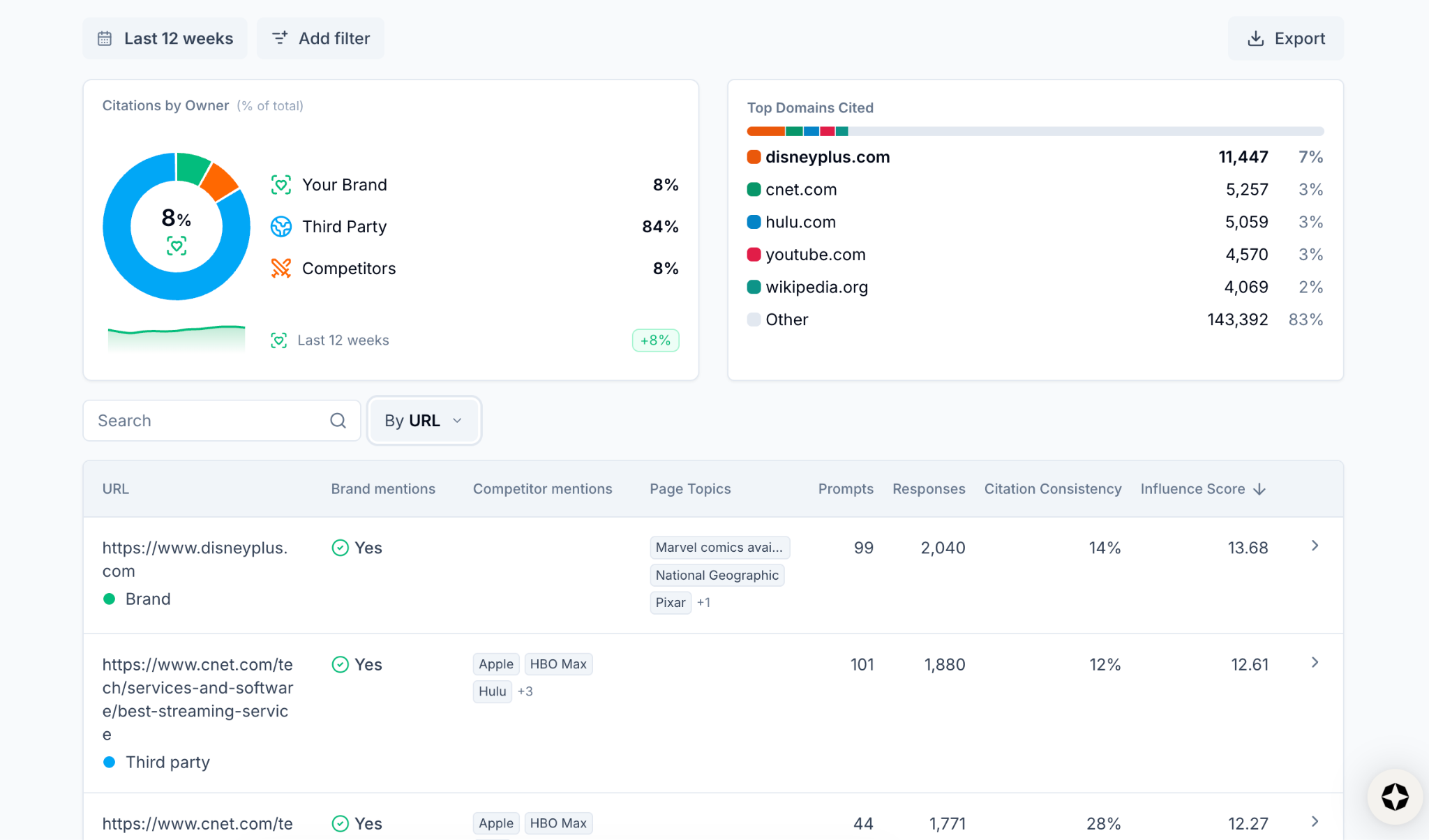 The result is a prioritized map of which sources are most influential for the prompts you care about and whether those sources are working for you or against you.